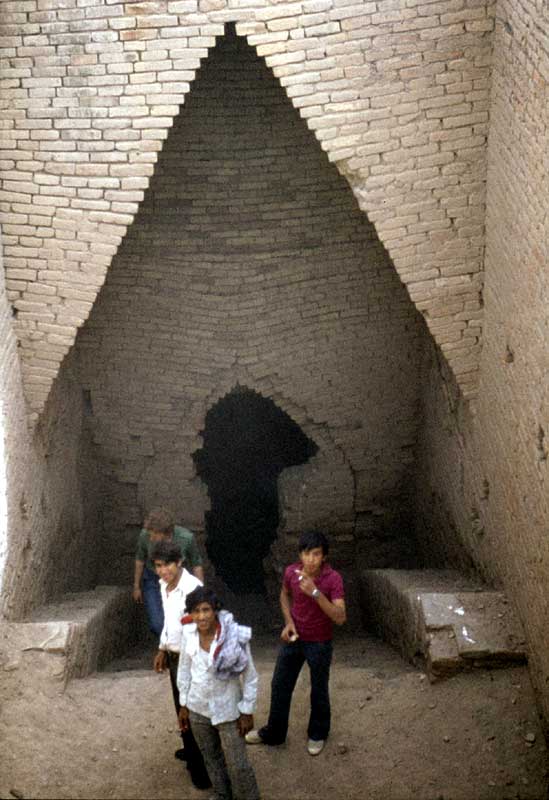 Der Eingang zu den Königsgräbern von Ur. Hier wurden die Könige von Ur zusammen mit den Mitgliedern der Hofhaltung in aufwändiger Weise bestattet. Kostbare Ausgrabungsgegenstände sind im Iraqi - Museum in Bagdad ausgestellt, u.a. die weltbekannte "Sumerische Harfe" mit Einlegearbeiten aus Muscheln, Elfenbein und Lapislazuli (möglicherweise ist dort jedoch im Jahr 2003 einiges abhanden gekommen). |