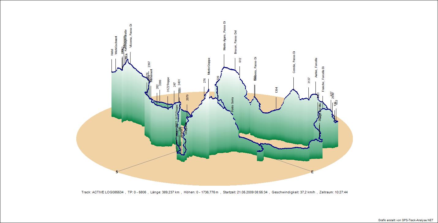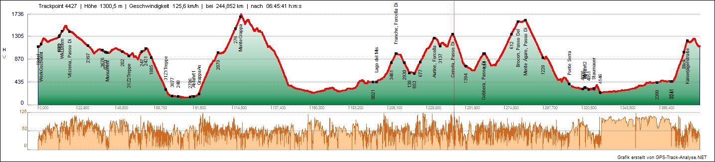 Das Hauptreiseziel des heutigen Tages ist der Monte Grappa und zur Erreichung habe ich eine große linksdrehende Schleife geplant. Wir bereisen damit wesentliche Teile des Gebietes der Sieben Gemeinden, das um das Jahr 1000n.C. von deutschen Bauern besiedelt wurde. Wie üblich um 9:00 Uhr beginnt unsere Fahrt, zuerst zu der mit Bedacht gewählten Gemeinde Luserna, denn das ist die Gemeinde, in der sich die Zimbrische Sprache am besten erhalten hat, weiter über den Passo di Vézzena nach Asiago, dem Hauptort der Sieben Gemeinden in dem übrigens auch Adriano Celentano lebt. Dort besuchen wir kurz das riesige Denkmal zur Erinnerung an den Dolomitenkrieg, ok, eigentlich fahren wir nur langsam vorbei denn der heutige Weg ist noch weit. Die Reise setzen wir also unmittelbar fort und halten am oberen Ende der Calà del Sasso genannten höchsten Treppe Europas, die gegen Ende des 14. Jh. gebaut wurde und dem Holztransport ins Tal diente. Für die nun ab Foza folgende Serpentinenstrecke hinab in das Tal der Brenta montieren wir die kleine Kamera auf dem Helm unseres R1-Kameramannes und beginnen den zügigen Abstieg. In südliche Richtung führt unsere Tour entlang der Brenta bis zum Anstieg zum Monte Grappa. Oben am Monte Grappa legen wir eine längere Pause ein auch um den herrlichen Blick hinab in die Ebene zu genießen. Leider ist die Sicht nicht klar, dann von hier aus soll bei günstigem Wetter die Aussicht bis nach Venedig möglich sein. Die Tour ist bedauerlicherweise wegen einer Streckensperrung in der geplanten Form nicht möglich und so muss der Passo di San Boldo entfallen, der aber unbedingt bei einer späteren Friaultour einzuplanen ist. Wir müssen in nördliche Richtung nach Feltre fahren um kurz darauf im Tal der Piave anzuhalten damit wir die Orientierung wieder erlangen. Dann also zurück nach Feltre und dort rechts ab zum sehenswerten Lago del Mis mit einer landschaftlich schönen Strecke im Norden des Sees. Von hier geht es über die Forcella di Franche nach Agordo wo unsere Reise durch einen Trauerzug für kurze Zeit unterbrochen wird. Danach geht die Fahrt weiter über die Forcella Aurine, den Passo di Cereda, Passo di Gobbera, Passo del Brocon, Passo di Monte Ágaro, die Ponte Serra, die wegen des darüber befindlichen Wasserfalls in eine weiße Wassernebelwand gehüllt ist, schließlich zum Lago del Corlo mit beeindruckender Staumauer. Die Zeit ist knapp geworden und so fahren wir komplett die SS47 bis nach Levico Terme um als würdigen Abschluss des heutigen Tages die Kaiserjägerstraße unter die Räder zu nehmen. Auf zweidrittel Höhe könnten wir eine schöne Aussicht auf die unten liegenden Seen genießen, aber mein Ansinnen löste, mutmaßlich auf Grund der fortgeschrittenen Zeit, nur Unverständnis bei einigen Teilnehmern aus, die wild gestikulierend zur Weiterfahrt mahnen... Also setzen wir ohne die Triebwerke zu stoppen sofort die kurze Fahrt ins Hotel fort. Maschinen parken, einige Kradisten waschen noch den Staub von ihren Maschinen, duschen, die Tafel ist bereits gedeckt. Jetzt müssen wir erfahren, dass ein weiterer Teilnehmer unserer Tour, der am Anreisetag überraschend verhindert war, bis nach Bozen gekommen ist, um dort in einem Tunnel die Wand zu touchieren; leider ebenfalls mit nicht unerheblichem Personenschaden. Er ist dann wieder mit dem ebenfalls beschädigten Krad nach Hause gefahren! Mann-o-Mann! Die besten Genesungswünsche an dieser Stelle auch an Dich! Schade, ich hätte gerne die eine oder andere Ausfahrt mit Dir und Deinem neuen Mopped gemacht - dann muss ich also bis zum Oktober warten! Neben drei wenig gravierenden 'Umfallern' ist damit aber die Negativserie unserer Reise ausgeschöpft, diese ist aber auch wesentlich länger als wir es uns je vorstellen konnten...