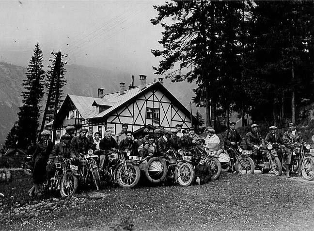 "Das Gruppenbild zeigt auf der rechten Seite eine T4. Die Ausflugsgesellschaft stammt dem Kennzeichen nach komplett aus München, Angaben über den Ort der Aufnahme gibt es aber nicht. Ist wohl der Triumphclub. Die T4 ist eine der jüngeren Maschine zusammen mit der K? auf dem linken Bildrand. Die dritte von links ist wahrscheinlich eine T350 mit MAG-Motor. Die wurde nach meiner Liste von 1931-1933 gebaut. Ich würde das Bild auf 1931 datieren, da andere neuere Modelle fehlen." [W. Kutschke]