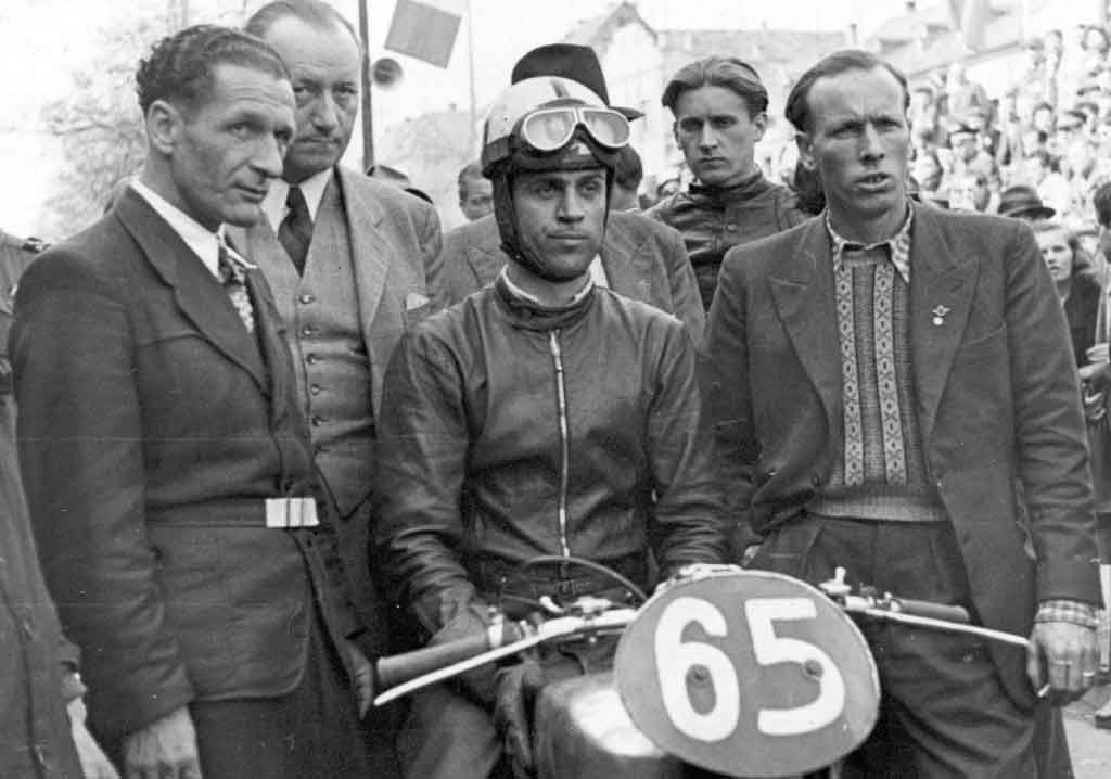 Max Grundstein (Bodmers "Schmiermaxe") links und Bodmer im Sattel.