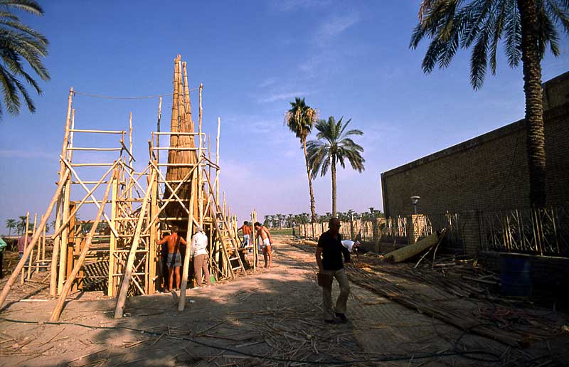 In ein Holzgerüst wurden 44 Bündel aus Berdi (Schilf) gelegt und fixiert. Das Boot ist ausschließlich mit solchen Materialien gebaut, die bereits vor 4000 Jahren zur Verfügung standen (im Schatten: Thor Heyerdahl). |