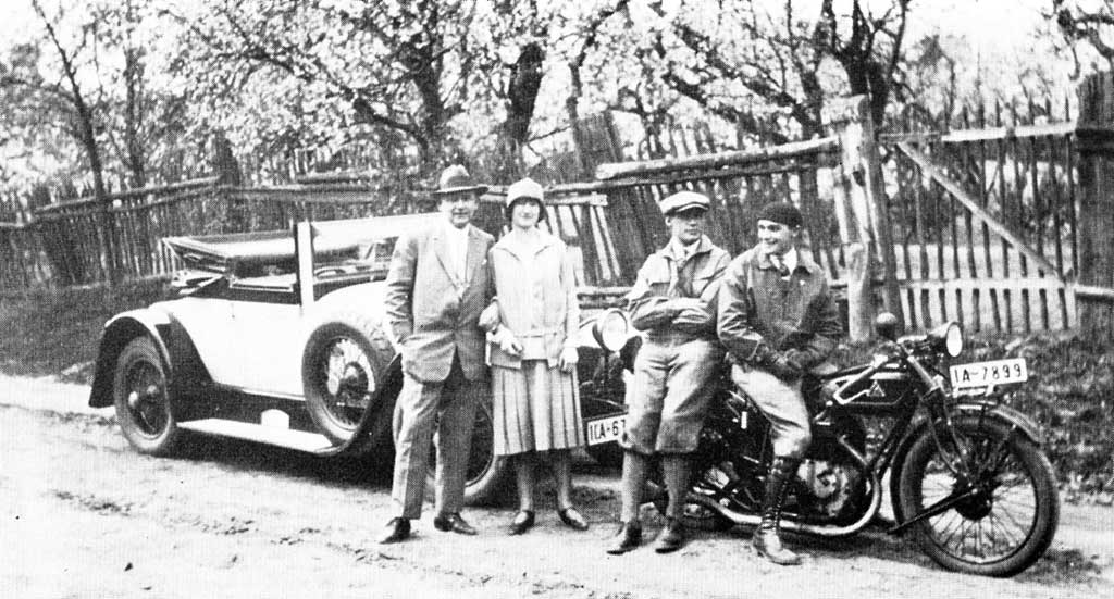 1928: Martin Stolle und Gattin, Brüder Ludwig und Franz Ischinger mit D-Rad Typ 06 Mit dem Höhepunkt der Wirtschaftskrise im Jahr 1929 musste das Motorradprogramm ohne durchschlagendem Erfolg auf billigere Zweitaktmodelle mit 198 ccm und 246 ccm Motoren von Bark umgestellt werden, die dann 1930 auf einen übersättigten Markt trafen. Dies führte dazu, mit NSU, Neckarsulm zusammen eine Vertriebsgesellschaft zu schliessen. D-Rad verschwand dann in kurzer Zeit vom Markt. Martin Stolle konstruierte in der Folgezeit jeweils während einer Wochenhälfte einen luftgekühlten Vierzylinder Boxermotor für die Automobilfabrik NAG (Vorläufer des Käfermotors) und in der jeweiligen anderen Wochenhälfte für Victoria die unglückliche KR 8. Dieser seitengesteuerte Zweizylindermotor mit 497 ccm Hubraum wurde in ein modernes Fahrwerk mit Seitenverkleidung eingebaut. Die Konstruktion der KR 8 war unausgereift und wurde dann durch die wechselgesteuerte KR 9 ersetzt, die noch andere Verbesserungen erhielt. Der Personenwagenbau bei NAG wurde eingestellt, sodass dieser luftgekühlte Vierzylindermotor auch nicht weiter gebaut wurde. Auf dem Zeichenbrett von Martin Stolle entstanden noch weitere bekannte und unbekannte Konstruktionen wie etwa ein Kleinmotorrad "Sursum" mit einem Zweitaktmotor und für die Gustloff-Werke in Suhl motorisierte Fahrräder. Im Krieg kamen Ideen für Tanks und Ausrüstung hinzu. Schliesslich wurde Martin Stolle Sachverständiger für das Kraftfahrzeugwesen. Martin Stolle starb am 25.09.1982 im 97. Lebensjahr. |