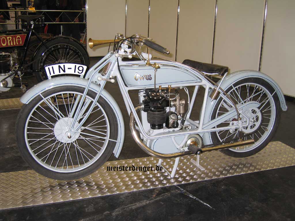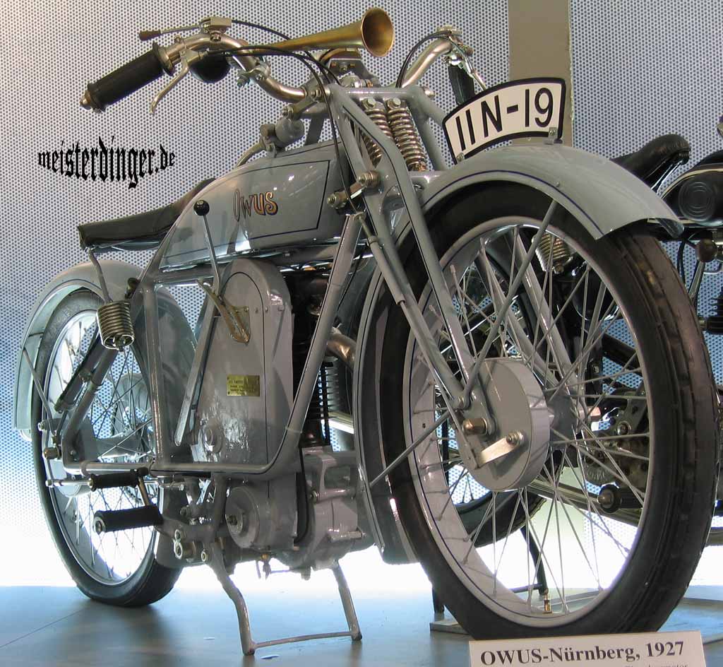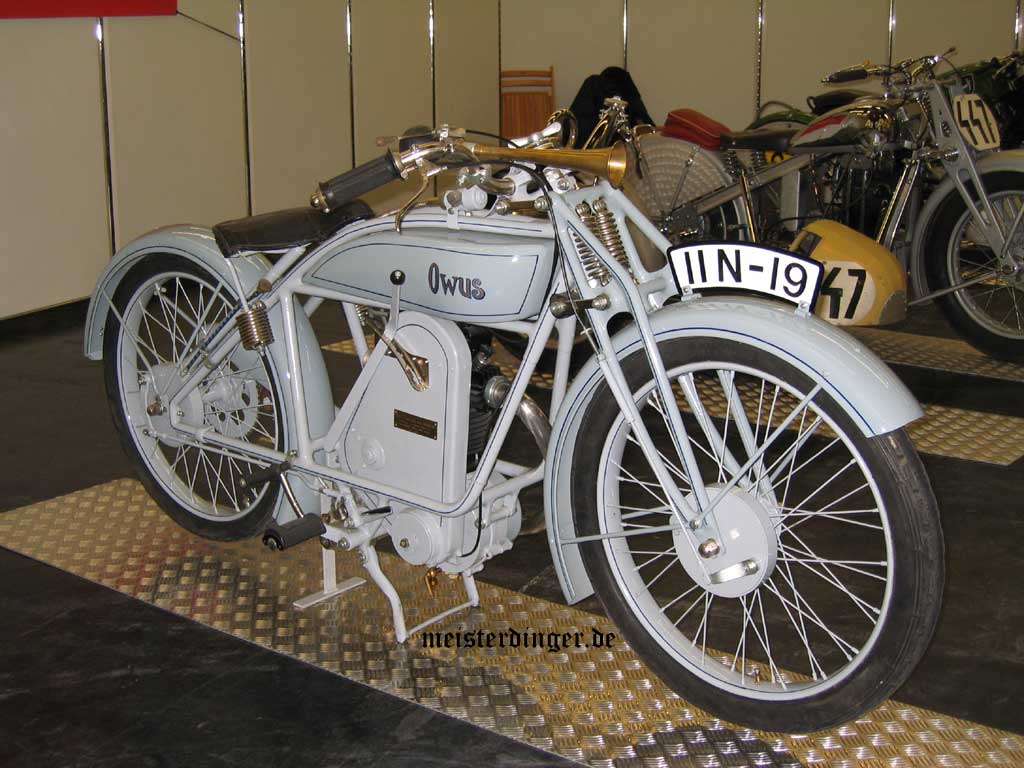 Das Motorrad wurde im Heft 11/2001 der Fachzeitschrift 'Oldtimer Markt' vorgestellt. Bild 1 2 der OWUS aus dem Jahr 1927 mit 249 ccm Einzylinder ohv- Eigenbaumotor mit 4,5 PS Leistung bei einer Bohrung von 65 mm und einem Hub von 75 mm. Das Leergewicht beträgt 97 kg. Die Maschine wurde im Museum Industriekultur in Nürnberg fotografiert. Bild 1 2 der OWUS, fotografiert bei der BikersWorld 2005 in Nürnberg. |